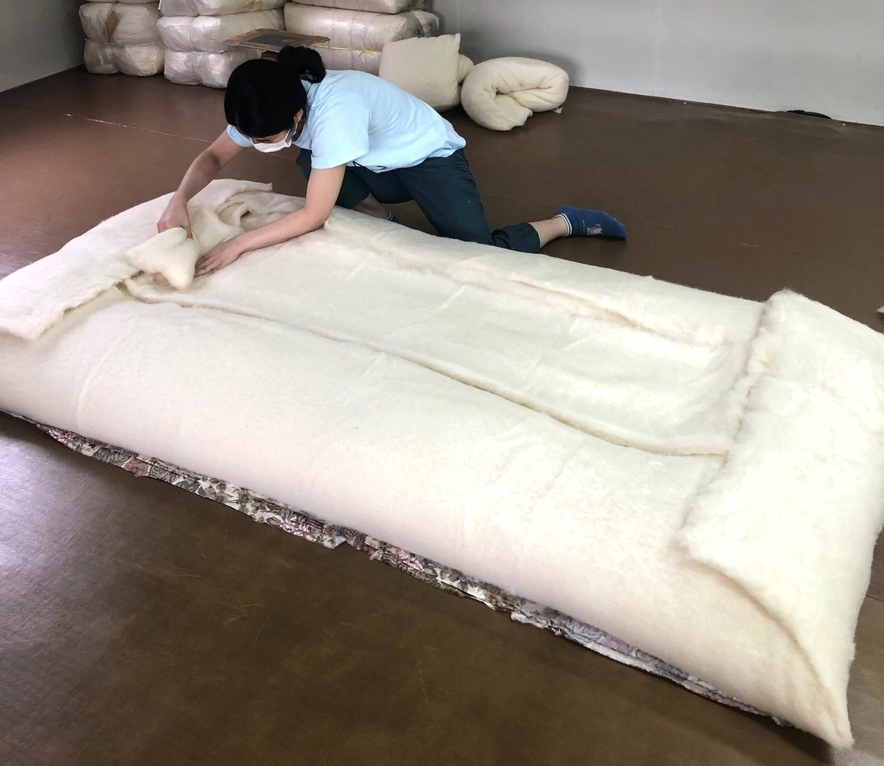 お手持ちの布団の状態、中の綿質の状態を確認し、厚さや重さ加減、ご自分で使うのか来客用なのか?一枚敷きなのか、二枚敷きとして使うのか?をしっかりとお客様と相談したうえで、職人が手作りで綿入れを行っております。